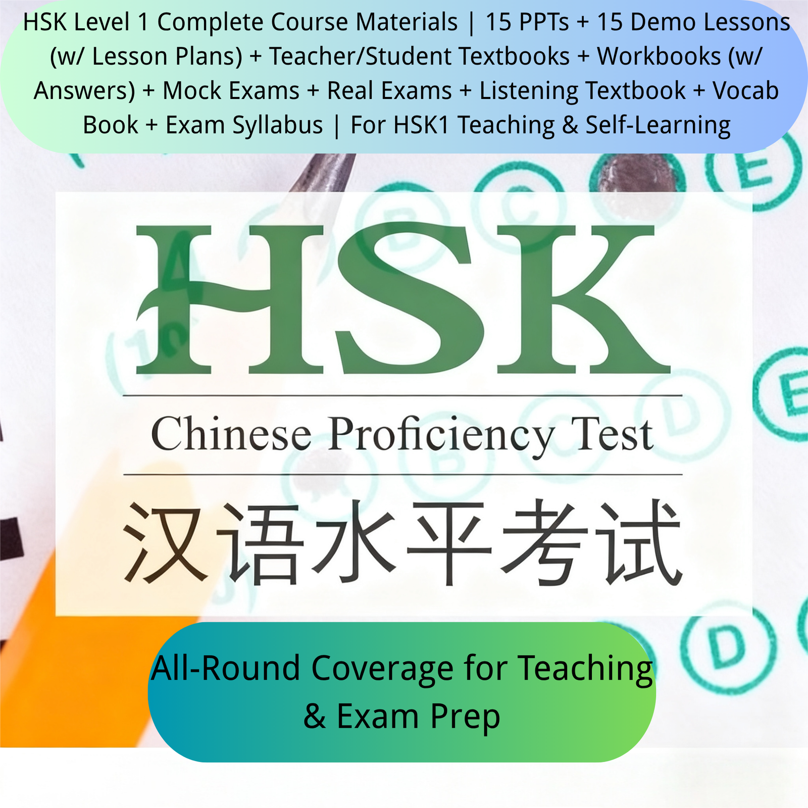 HSK Level 1 Complete Course Materials | 15 PPTs + 15 Demo Lessons (with Lesson Plans) + Teacher/Student Textbooks + Workbooks (w/ Answers) + Mock Exams + Real Exams + Listening Textbook + Vocab Book + Exam Syllabus | For HSK1 Teaching & Self-Learning